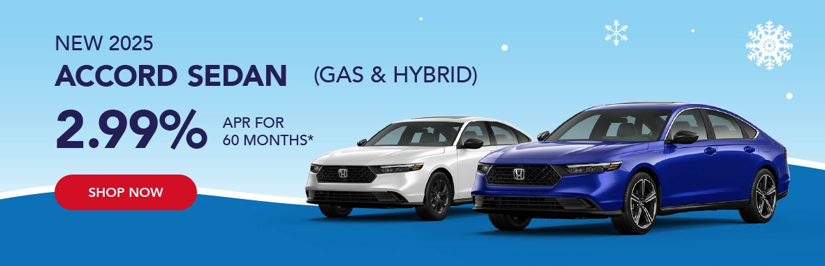 *Based on approved credit through Honda Financial Services. Must finance through Honda Financial Services. Offers are subject to change. Sales tax, licensing fees, registration fees, $565 Administrative fee, property tax are not included in the sale price. See dealer for complete details. Offer is good on new and not previously reported sold 2025 Accord Sedan Gas and Hybrid models. Residency restrictions apply. Customer must be a resident of one of the following states and register the vehicle in one of the following states: AK, AL,AR, District of Columbia, GA, ID, KS, LA, MD, MO, MS, MT, NC, NM, OK, OR, SC, TN, TX, VA, WA, WV, WY. Dealer installed accessories, if applicable, are added to the vehicle price. Offers end 3/2/2026.