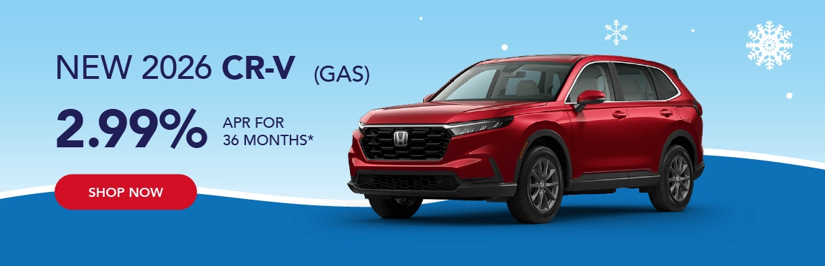 *Based on approved credit through Honda Financial Services. Must finance through Honda Financial Services. Offers are subject to change. Sales tax, licensing fees, registration fees, $565 Administrative fee, property tax are not included in the sale price. See dealer for complete details. Offer is good on new and not previously reported sold 2026 Honda CR-V Gas models. Residency restrictions apply. Customer must be a resident of one of the following states and register the vehicle in one of the following states: AK, AL,AR, District of Columbia, GA, ID, KS, LA, MD, MO, MS, MT, NC, NM, OK, OR, SC, TN, TX, VA, WA, WV, WY. Dealer installed accessories, if applicable, are added to the vehicle price. Offers end 3/2/2026.