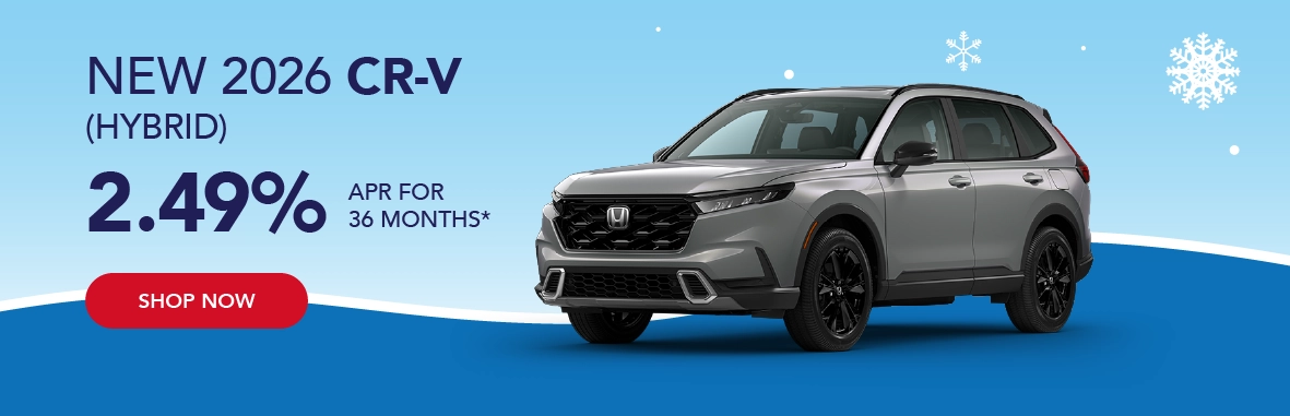 *Based on approved credit through Honda Financial Services. Must finance through Honda Financial Services. Offers are subject to change. Sales tax, licensing fees, registration fees, $565 Administrative fee, property tax are not included in the sale price. See dealer for complete details. Offer is good on new and not previously reported sold 2026 Honda CR-V Hybrid models. Residency restrictions apply. Customer must be a resident of one of the following states and register the vehicle in one of the following states: AK, AL,AR, District of Columbia, GA, ID, KS, LA, MD, MO, MS, MT, NC, NM, OK, OR, SC, TN, TX, VA, WA, WV, WY. Dealer installed accessories, if applicable, are added to the vehicle price. Offers end 3/2/2026.