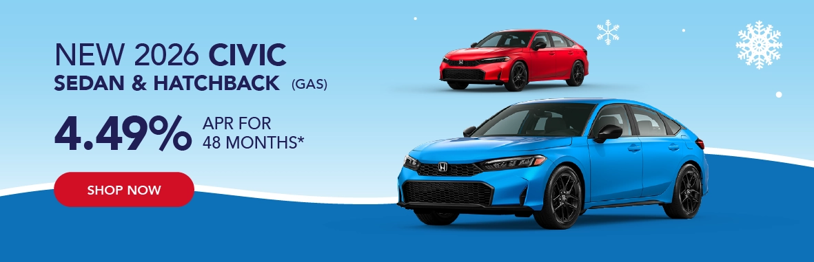 *Based on approved credit through Honda Financial Services. Must finance through Honda Financial Services. Offers are subject to change. Sales tax, licensing fees, registration fees, $565 Administrative fee, property tax are not included in the sale price. See dealer for complete details. Offer is good on new and not previously reported sold 2026 Honda Civic Sedan and Hatchback models (Gas only). Civic Si and Civic Type R excluded. Residency restrictions apply. Customer must be a resident of one of the following states and register the vehicle in one of the following states: AK, AL,AR, District of Columbia, GA, ID, KS, LA, MD, MO, MS, MT, NC, NM, OK, OR, SC, TN, TX, VA, WA, WV, WY. Dealer installed accessories, if applicable, are added to the vehicle price. Offers end 3/2/2026.