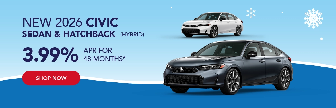 *Based on approved credit through Honda Financial Services. Must finance through Honda Financial Services. Offers are subject to change. Sales tax, licensing fees, registration fees, $565 Administrative fee, property tax are not included in the sale price. See dealer for complete details. Offer is good on new and not previously reported sold 2026 Honda Civic Sedan and Hatchback models (Hybrid only). Residency restrictions apply. Customer must be a resident of one of the following states and register the vehicle in one of the following states: AK, AL,AR, District of Columbia, GA, ID, KS, LA, MD, MO, MS, MT, NC, NM, OK, OR, SC, TN, TX, VA, WA, WV, WY. Dealer installed accessories, if applicable, are added to the vehicle price. Offers end 3/2/2026.