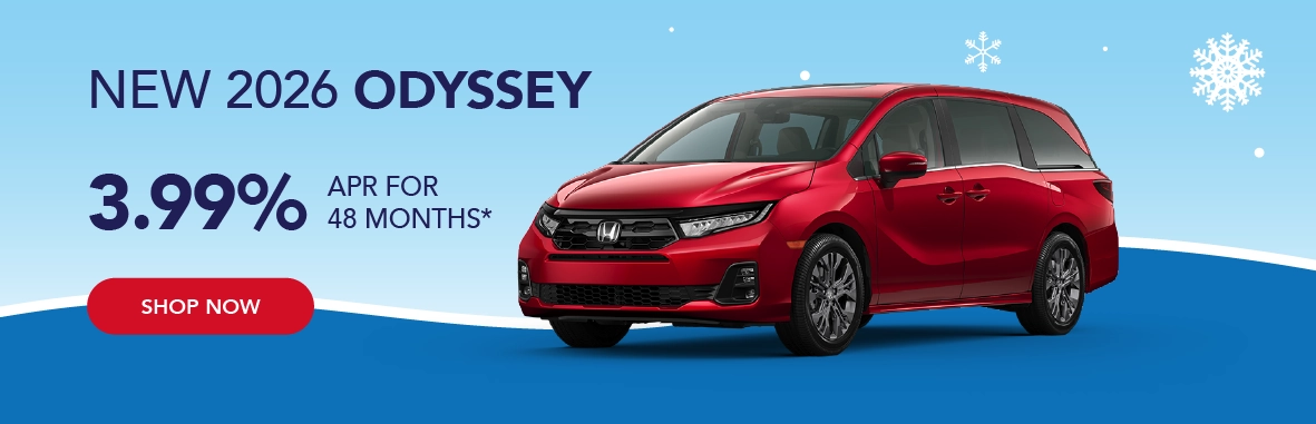 *Based on approved credit through Honda Financial Services. Must finance through Honda Financial Services. Offers are subject to change. Sales tax, licensing fees, registration fees, $565 Administrative fee, property tax are not included in the sale price. See dealer for complete details. Offer is good on new and not previously reported sold 2026 Odysseys. Residency restrictions apply. Customer must be a resident of one of the following states and register the vehicle in one of the following states: AK, AL,AR, District of Columbia, GA, ID, KS, LA, MD, MO, MS, MT, NC, NM, OK, OR, SC, TN, TX, VA, WA, WV, WY. Dealer installed accessories, if applicable, are added to the vehicle price. Offers end 3/2/2026.