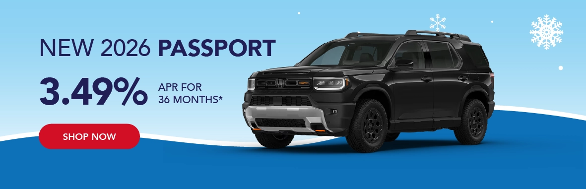 *Based on approved credit through Honda Financial Services. Must finance through Honda Financial Services. Offers are subject to change. Sales tax, licensing fees, registration fees, $565 Administrative fee, property tax are not included in the sale price. See dealer for complete details. Offer is good on new and not previously reported sold 2026 Honda Passport models. Residency restrictions apply. Customer must be a resident of one of the following states and register the vehicle in one of the following states: AK, AL,AR, District of Columbia, GA, ID, IL, KS, LA, MD, MO, MS, MT, NC, NM, OK, OR, SC, TN, TX, VA, WA, WV, WY. Dealer installed accessories, if applicable, are added to the vehicle price. Offers end 3/2/2026.