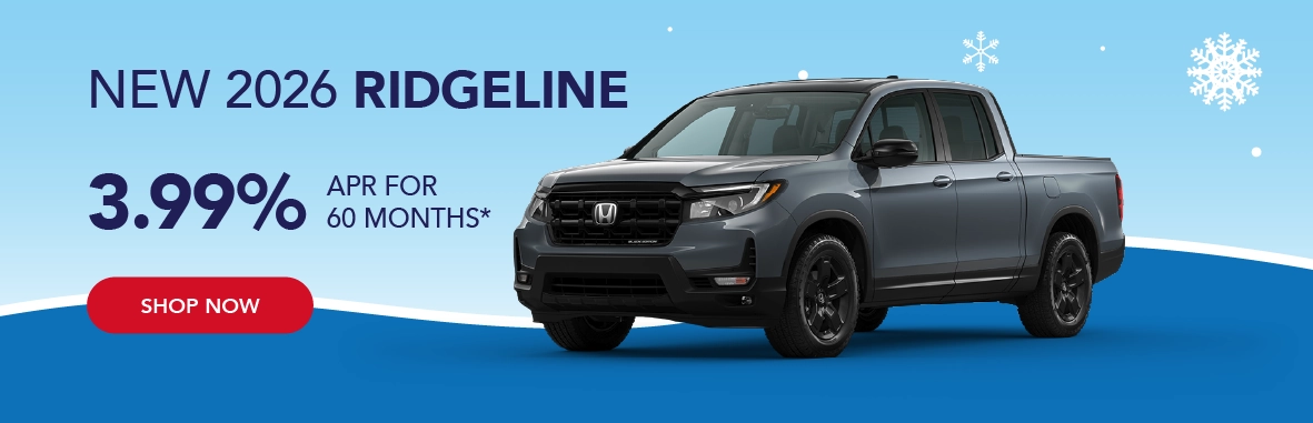 *Based on approved credit through Honda Financial Services. Must finance through Honda Financial Services. Offers are subject to change. Sales tax, licensing fees, registration fees, $565 Administrative fee, property tax are not included in the sale price. See dealer for complete details. Offer is good on new and not previously reported sold 2026 Ridgelines. Residency restrictions apply. Customer must be a resident of one of the following states and register the vehicle in one of the following states: AK, AL,AR, District of Columbia, GA, ID, KS, LA, MD, MO, MS, MT, NC, NM, OK, OR, SC, TN, TX, VA, WA, WV, WY. Dealer installed accessories, if applicable, are added to the vehicle price. Offers end 3/2/2026.