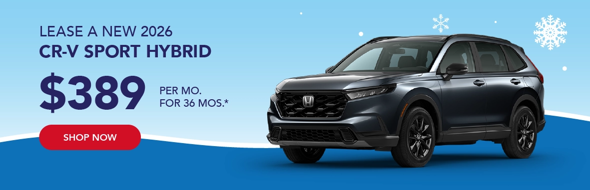*2026 CR-V Sport Hybrid - $389 per month / 36 months / 10,000 miles per year / $2,999 down payment / First payment and $565 registration due at signing / Total due at signing $3,953 / Sales tax, licensing, registration not included / $595 Honda Financial Services Bank Fee included / Residency restrictions apply / Based on approved credit through Honda Financial Services / Not all customers will qualify / See dealer for complete details / Offers end 3/2/2026.