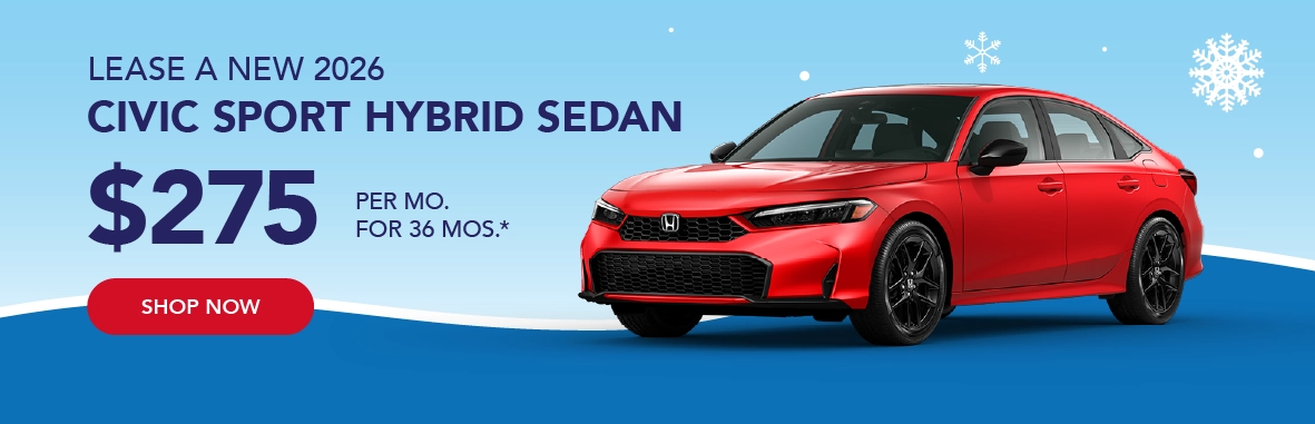 *2026 Honda Civic Sport Hybrid Sedan - $275 per month / 36 months / 10,000 miles per year / $2,999 down payment / First payment and $565 registration due at signing / Total due at signing $3,839 / Sales tax, licensing, registration not included / $595 Honda Financial Services Bank Fee included / Residency restrictions apply / Based on approved credit through Honda Financial Services / Not all customers will qualify/ See dealer for complete details / Offers end 3/2/2026.