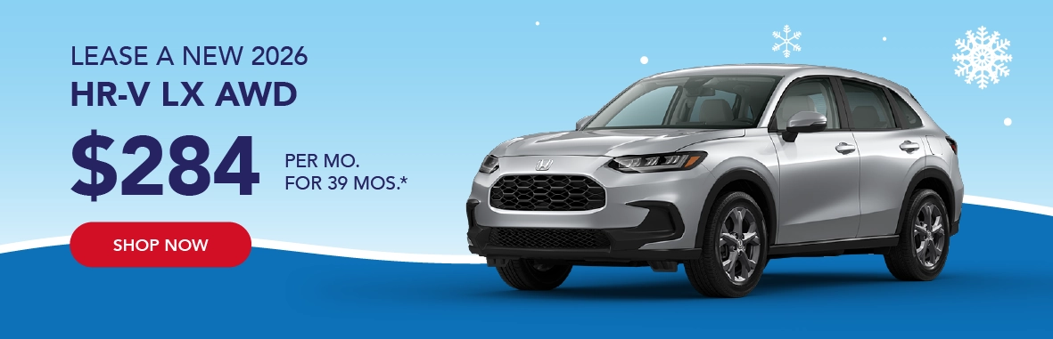 *2026 Honda HR-V LX AWD - $284 per month / 39 months / 10,000 miles per year / $2,999 down payment / First payment and $565 registration due at signing / Total due at signing $3,848 / Sales tax, licensing, registration not included / $595 Honda Financial Services Bank Fee included / Residency restrictions apply / Based on approved credit through Honda Financial Services / Not all customers will qualify / See dealer for complete details / Offers end 3/2/2026.