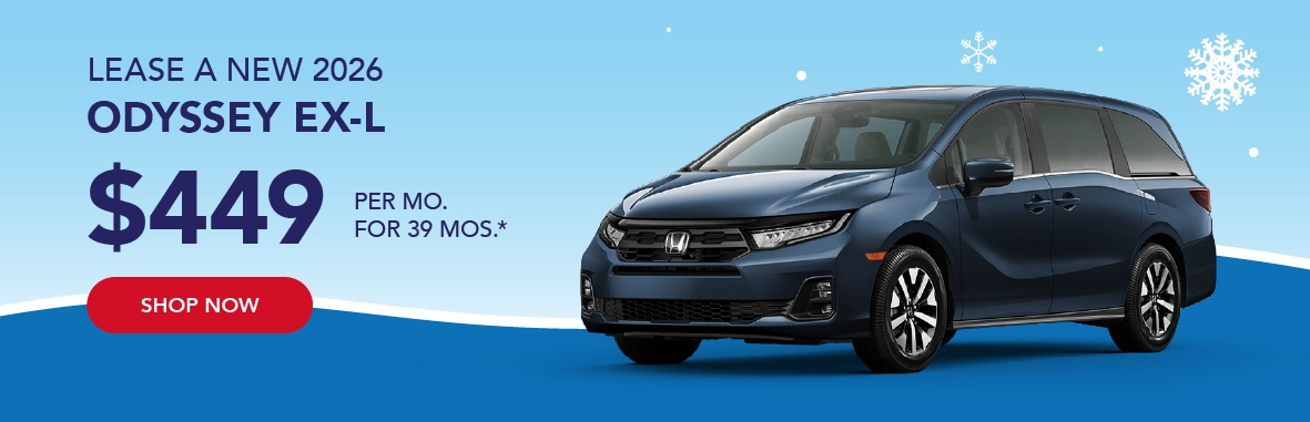 *2026 Honda Odyssey EX-L - $449 per month / 39 months / 10,000 miles per year / $2,499 down payment / First payment and $565 registration due at signing / Total due at signing $3,513 / Sales tax, licensing, registration not included / $595 Honda Financial Services Bank Fee included / Residency restrictions apply / Based on approved credit through Honda Financial Services / Not all customers will qualify / See dealer for complete details / Offers end 3/2/2026.