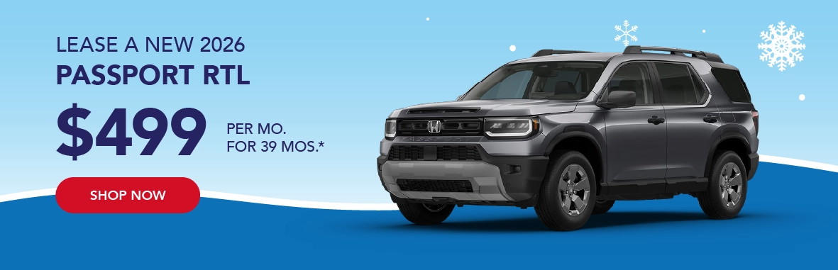 *2026 Honda Passport RTL - $499 per month / 39 months / 10,000 miles per year / $3,999 down payment / First payment and $565 registration due at signing / Total due at signing $5,063 / Sales tax, licensing, registration not included / $595 Honda Financial Services Bank Fee included / Residency restrictions apply / Based on approved credit through Honda Financial Services / Not all customers will qualify / See dealer for complete details / Offers end 3/2/2026.